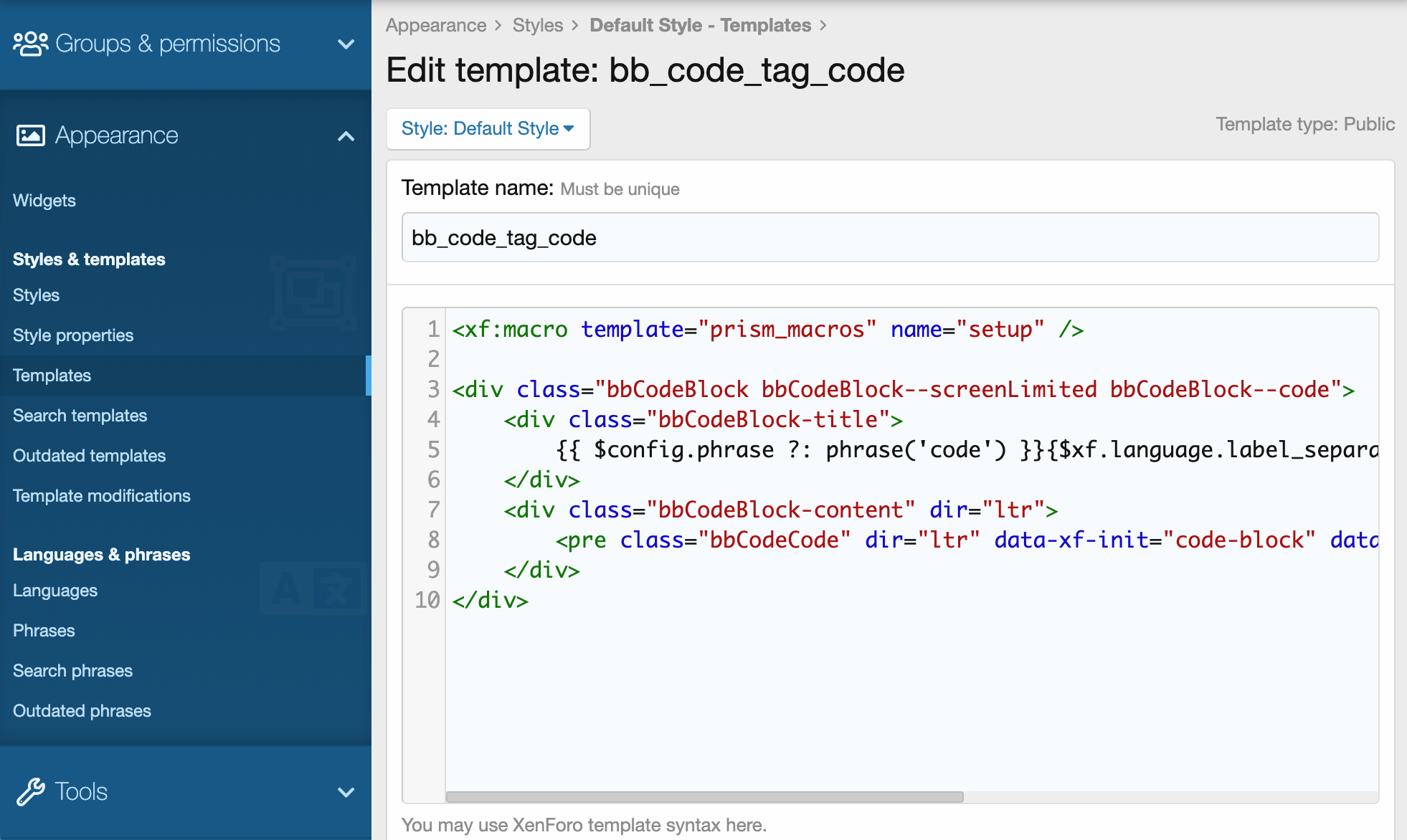 The entire application interface for XenForo is handled through a purpose-built template system, which combines HTML with XenForo Template Syntax.