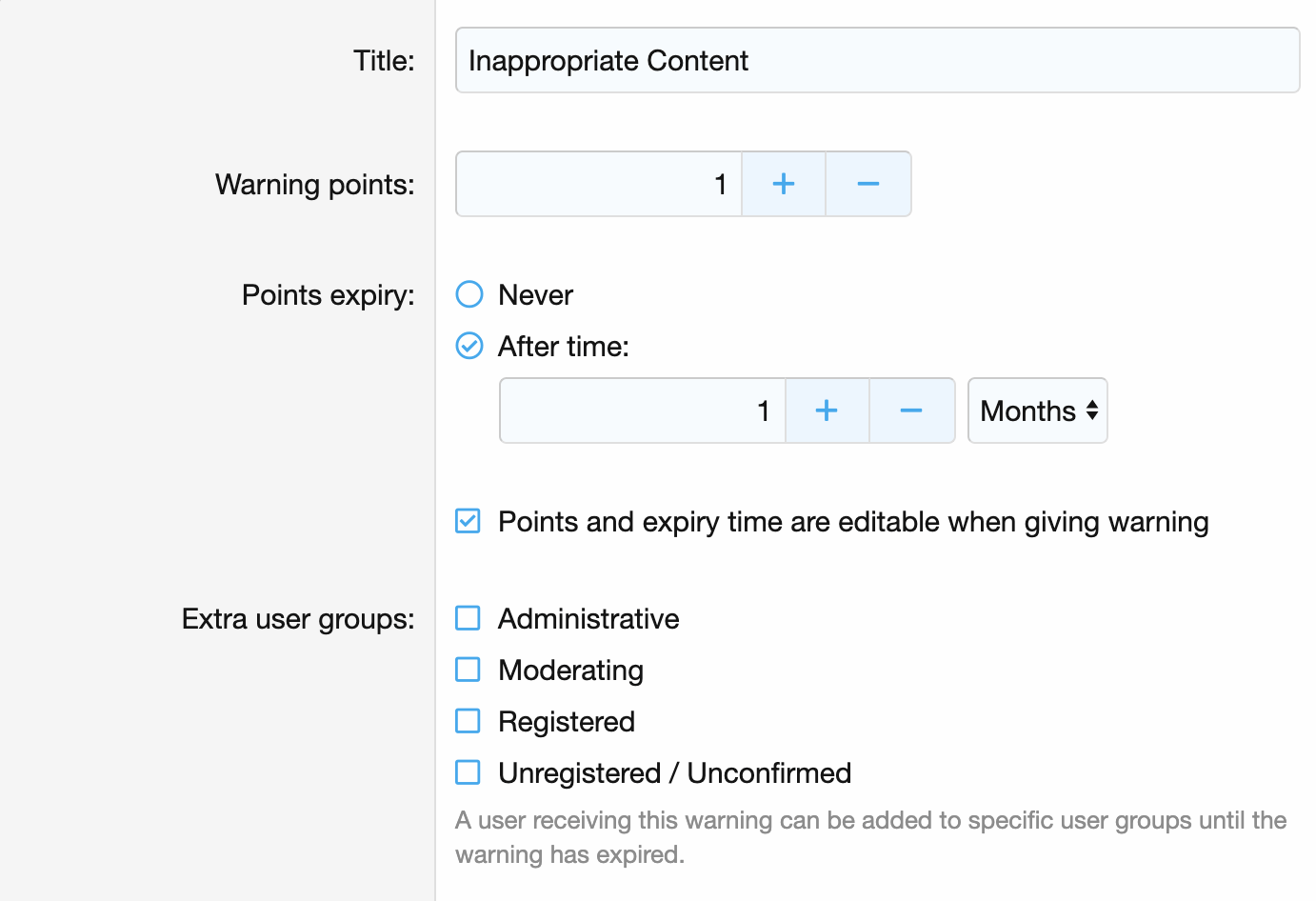 Warnings can act cumulatively, so the most recent warning may trigger an automated sanction against the offending user such as a temporary suspension of privileges or even an outright ban - all without the staff having to keep a manual log of trouble-makers.